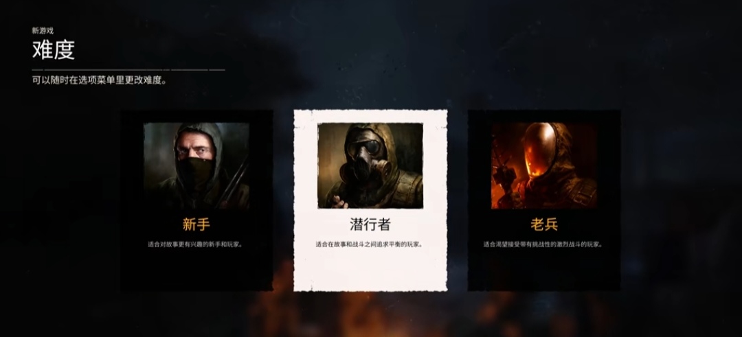 游戏总共三档难度,难度可在设置——游戏中随意更改,所以建议大家先用“新手”难度渡过前期,多搜集些物资,拥有强力武器后再考虑开启二档难度。