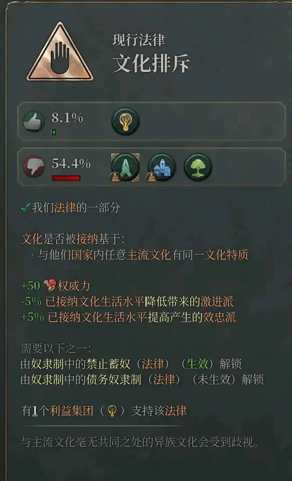 看起来还不错,然而这个法律的精髓就在于当场歧视你国家里90%的人,这个歧视效果甚至远超族裔国家,然而给的正面buff却远不如族裔国家,相信各位应该都发现过,在自己点下该法律后,短时间内激进派飙升,效忠派骤减,经济也出现中等幅度的下降了