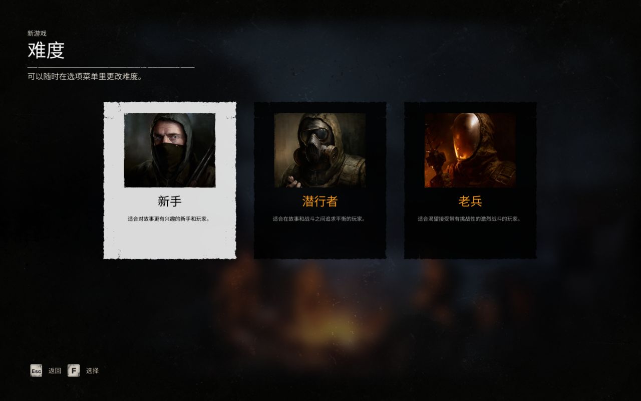 一進到遊戲,會看到本作給了我們三種可選難度,分別是新手,潛行者和老兵