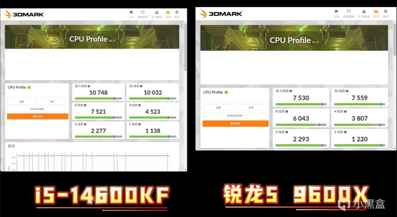在3DMark CPU Profile測試中,i5-14600KF最小線程得分1138分,稍稍落後銳龍5 9600X。但是多線程下,i5-14600KF無敵了,比如最大線程,10748分對7530分,領先超42%。