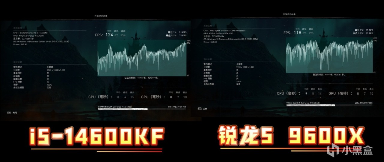 在《刺客信條:英靈殿》測試中,i5-14600KF的平均幀跑到124幀,而銳龍5 9600X只跑到118幀,同樣是i5-14600KF勝出。