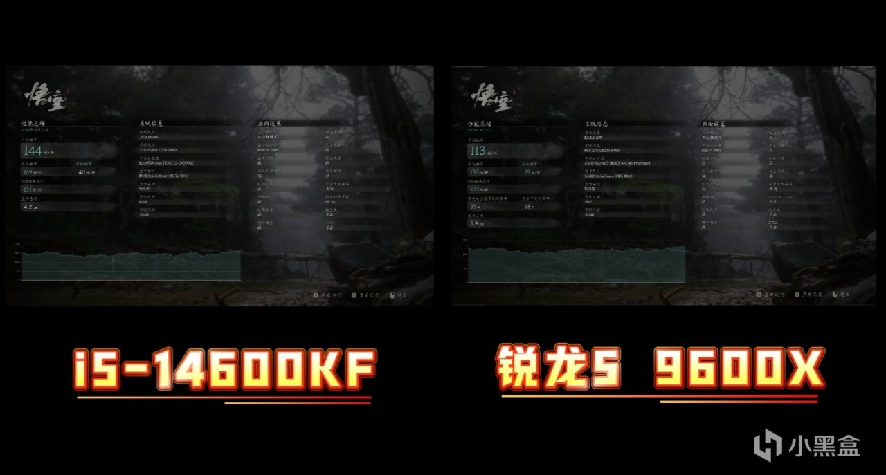 在《黑神話:悟空》測試中,i5-14600KF的平均幀跑到144幀,而銳龍5 9600X只跑到113幀,i5-14600KF保持優勢。