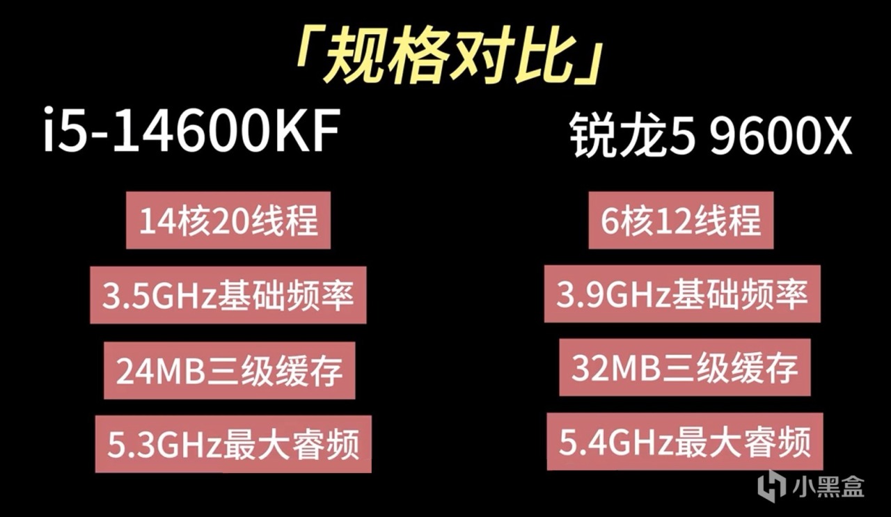 在頻率上,基礎頻率與最大睿頻,銳龍5 9600X稍領先於i5-14600KF,喫單核的應用與遊戲中,兩者可能打得有來有回。同樣遊戲看中的三級緩存大小,也是銳龍5 9600X要大些。