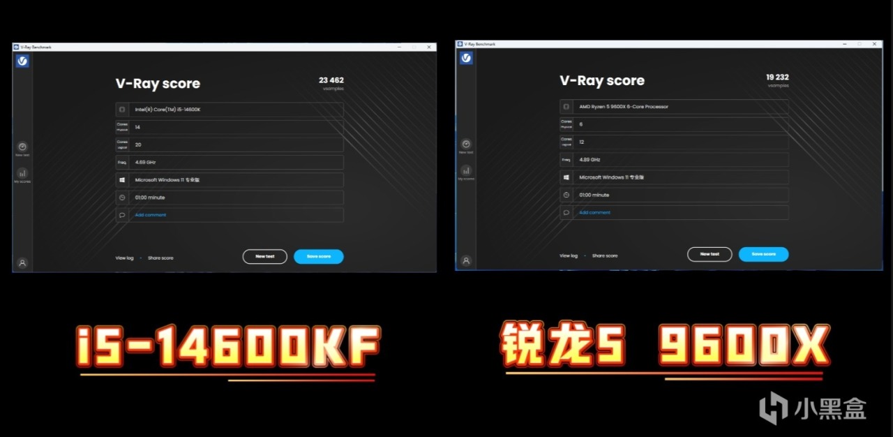 在生產力工具中V-Ray渲染測試中,i5-14600KF得分爲23452分,而銳龍5 9600X只跑出19232分,i5-14600KF的優勢相當明顯。