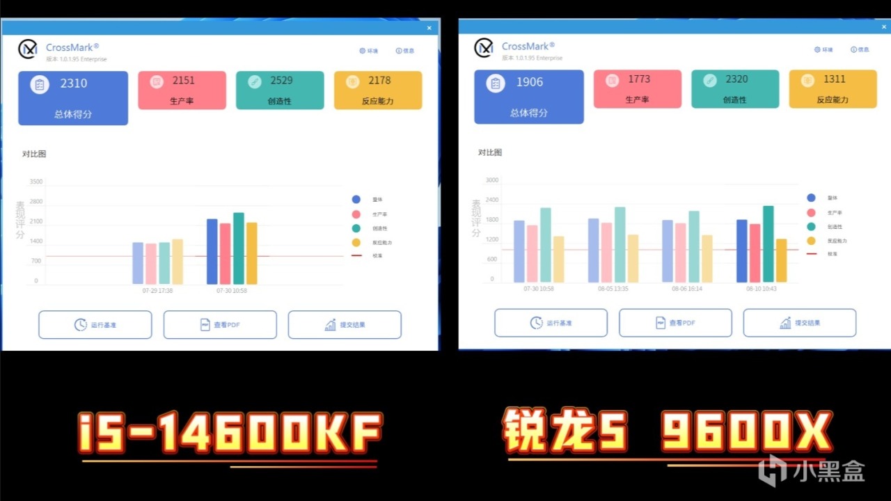 在CrossMark測試中,i5-14600KF總得分2310分,銳龍5 9600X總得分1906分,不管是生產率,創造性,還是反應能力測試中,都佔據優勢。
