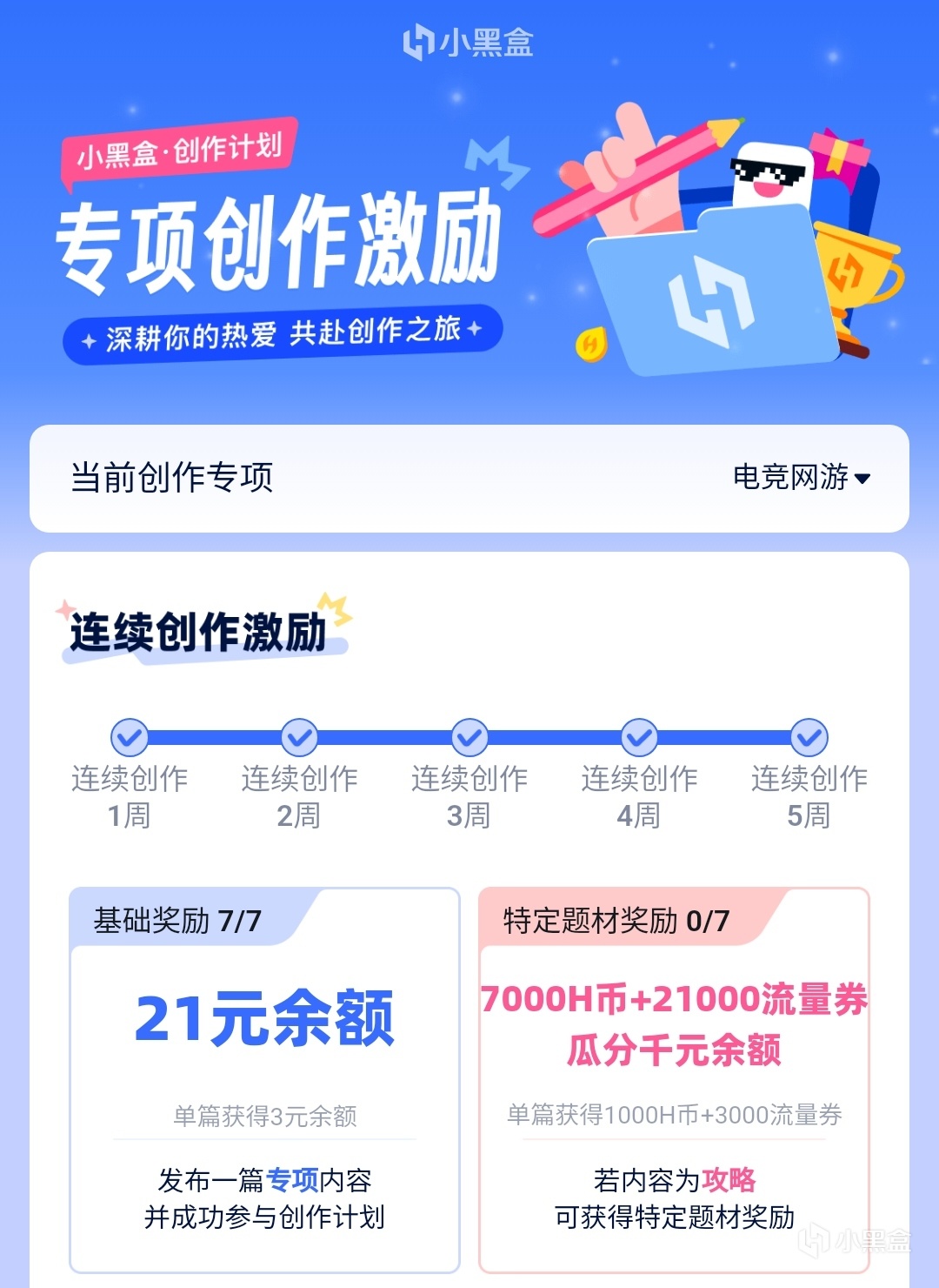 這個我覺得算是小黑盒對新人比較友好的激勵活動了,你只需要選擇合適的創作專項,並且發佈攻略類題材的文章並且打上對於的標籤就可以獲得比較多的盒幣,同時還有餘額獎勵
