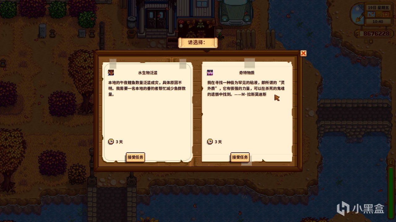 ①第一年秋季2日進入鵜鶘鎮觸發,任務每逢週一刷新,每週會有兩個新任務,兩個任務只能選擇其中一個接取。