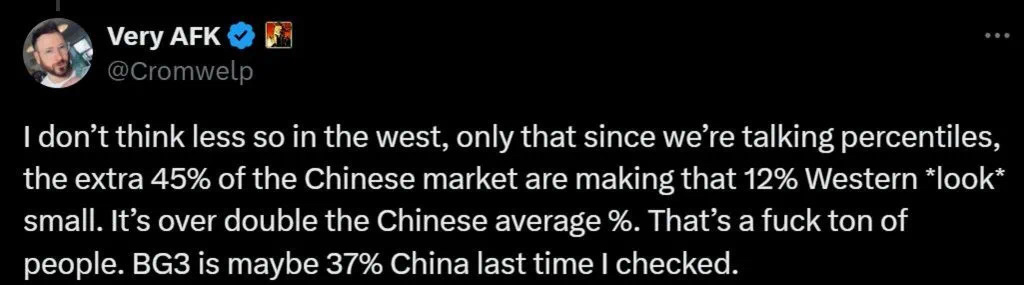 关于这一点,去年TGA年度游戏《博德之门3》的发行总监就亲自出来证实过。他曾经表示《博德之门3》销量的37%都是来自于中国玩家,因此Steam上任何一款高销量游戏,本身就离不开中国玩家的支持。