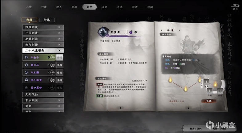 作爲外門弟子時運氣好點的話門派會有一些對應武學的化境券,這就是加入宗門門的特殊好處之一。那麼化境卷有什麼用呢?我們在修煉武學的時候,比如說28星宿劍法後面,正常我們獲得這個28星宿劍只能練到精通,當我們到對應的境界時他會解鎖對應詞條,如果我們還想繼續解鎖那我們就要兌換這種化境券,在我們使用這個化境卷之後就可以解鎖第四個格子。這個可以說是非常非常的重要,因爲後面的詞條屬性都比較強大所以說你化境不化境差的真的很多,有時候多一個詞條一個功法的屬性可能就天差地別。