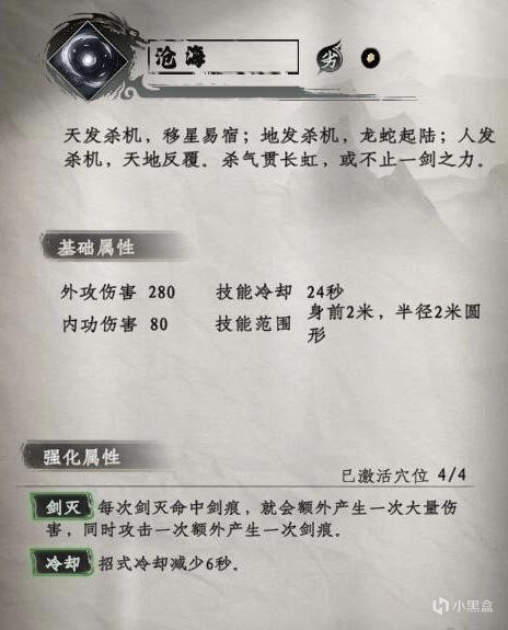 滄海:對身前圓形區域內敵方單位造成傷害,基礎屬性爲外攻傷害280,內功傷害80,技能冷卻30秒,技能範圍身前2米,半徑2米圓形。強化屬性爲劍滅,每次劍滅命中會有劍痕,額外產生一次大量傷害,同時攻擊一次額外產生一次劍痕,招式冷卻減少6秒12。
