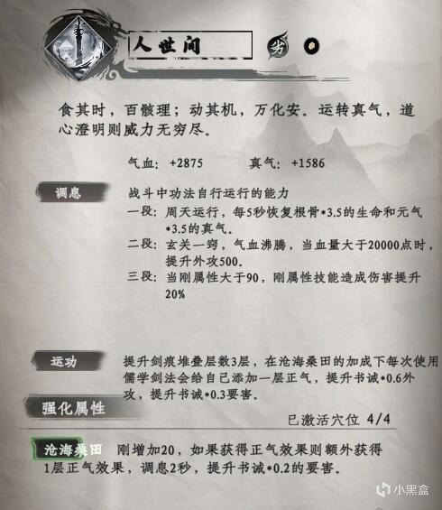 運功:劍痕堆疊層數+3,在滄海桑田的加成下每次使用儒學劍法會給自己添加一層正氣,提升書戒0.6的外攻和書戒0.3的要害。