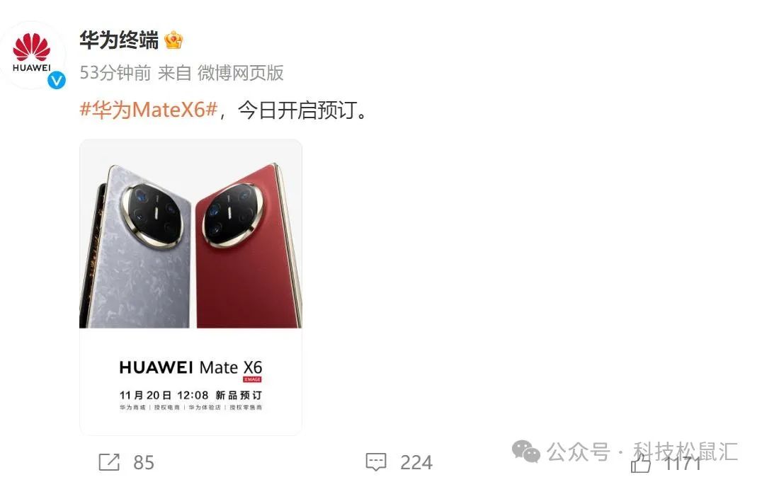 11月4日,餘承東正式官宣華爲mate70系列將於本月發佈,11月18日,華爲Mate70開啓預訂並正式官宣11月26日發佈。華爲mate70纔是華爲走量的機型,至於首銷能賣多少,那就要看華爲備貨了多少,畢竟華爲的旗艦手機剛上市都是一機難求。除了mate70,11月20日,摺疊屏手機X6也開啓預約,並正式官宣將於11月26日和mate70一起發佈,華爲2024王炸組合將登場。
