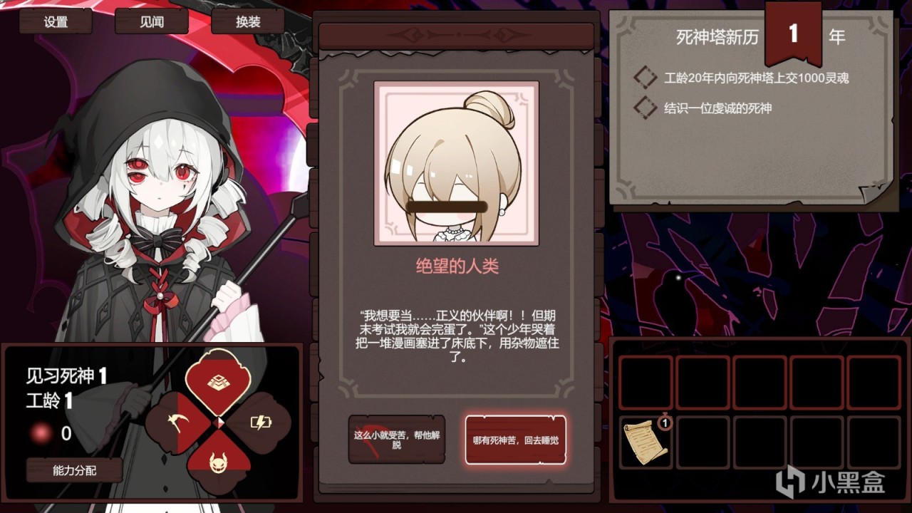 游戏的玩法是很简单的,遇到的大部分人或事件都会提供2个选择,玩家需要的就是从两个里面做选择。游戏中玩家有4个属性,选择可能会增加或减少某几个属性,由于死神必须保持中立,所以一旦某个属性达到最大或最小就会触发结局,并回归死神塔从头开始,换言之,游戏的核心玩法就是要维持4个属性的平衡。听上去并不难,但是实际玩起来就会发现还真不是那么好掌控的,不过游戏中也提供了一些额外的帮助,比如“神谕”,某些神谕会提供看清数值变化的效果,有些神谕会让某个属性维持在某个数值不动。不过即使尽量避免了属性达到极端,到了规定的年限还是会回归死神塔交灵魂的。