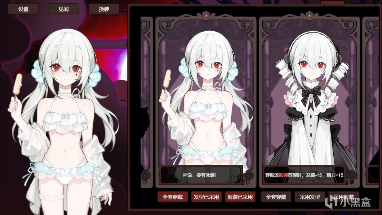 如果说该游戏有什么最吸引我,那毫无疑问就是游戏的美术啦!白发红瞳的萝莉特莉波卡本身就已经足够可爱了,在本作里作为主角待遇又提高了,画师为她增添了许多套服装,像是在《庭院》里的女仆打扮,温柔可爱的冬日邀约套装,还有“神说要有泳装”的泳装,简直是可爱到爆!而Q版的各种结局也是各种意义上的可爱,既有摸鱼达人,也有高傲女王。一句话,美术上大分!