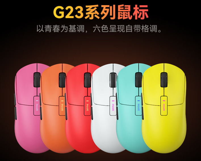 因科特 G23 鼠标在外观颜色上大胆创新,提供了猛男粉、橘橙、正红、墨白、蓝冰色、赛博黄等多种明艳的颜色选择。