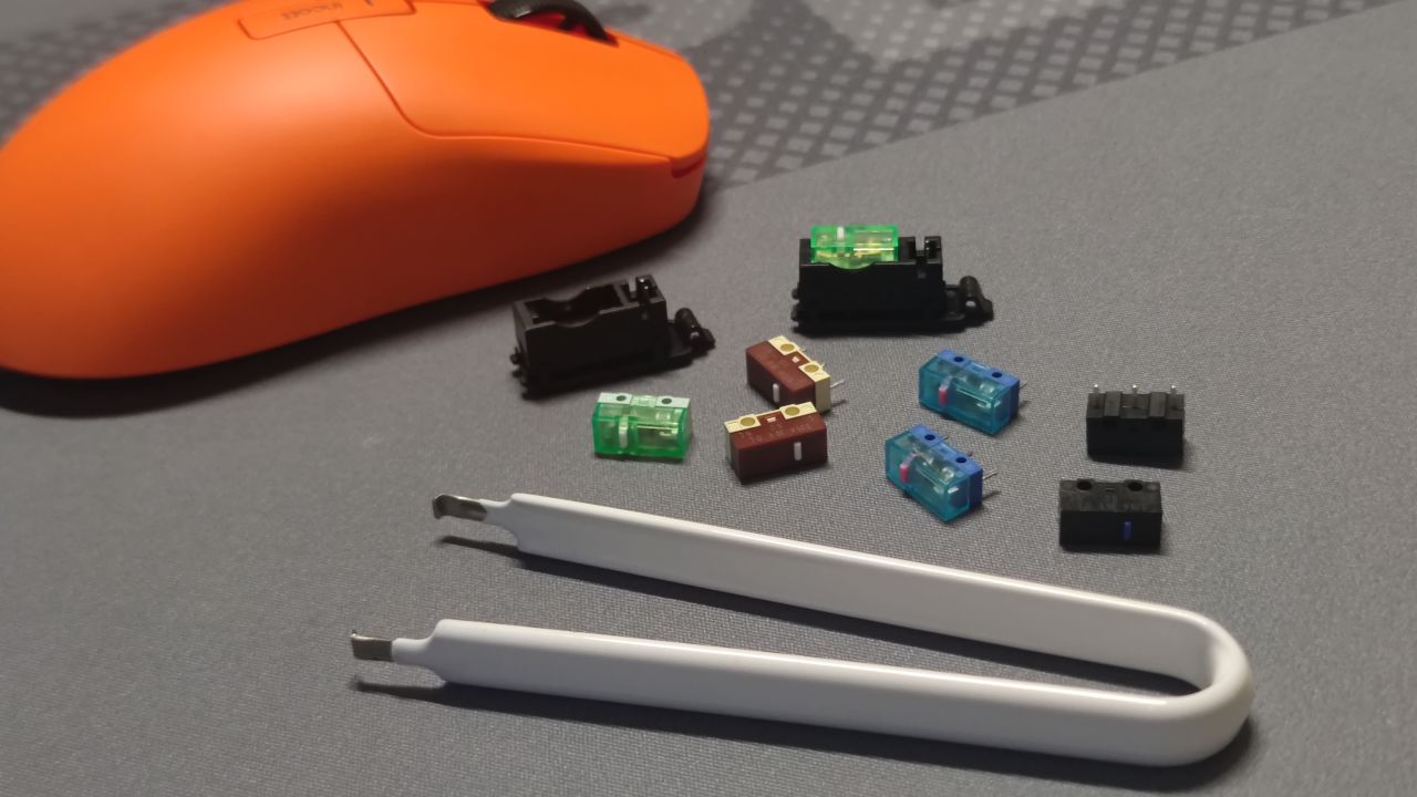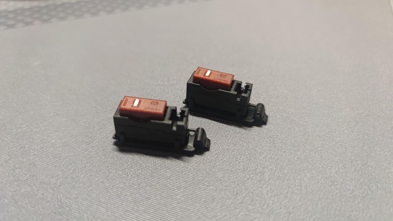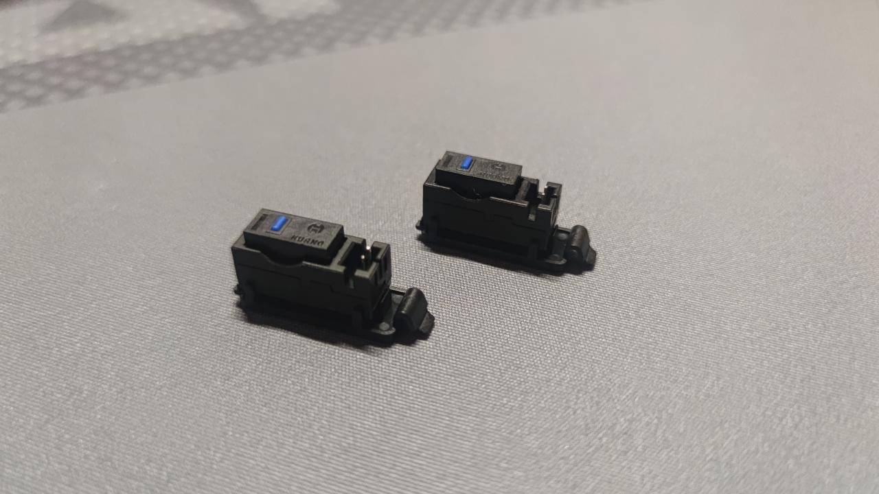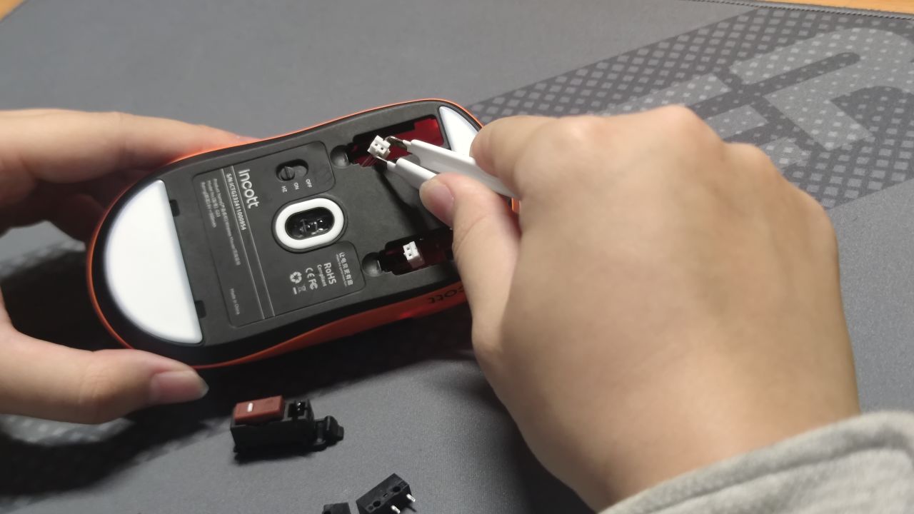 G23在左右按键的底部设计了两个可以灵活拆卸的卡扣,对应微动区域。扣开后可以看到微动、微动底座、连接线材。握住微动底座,一抽就能把微动抽开,换个喜欢的装上去就行,记得对准方向。
