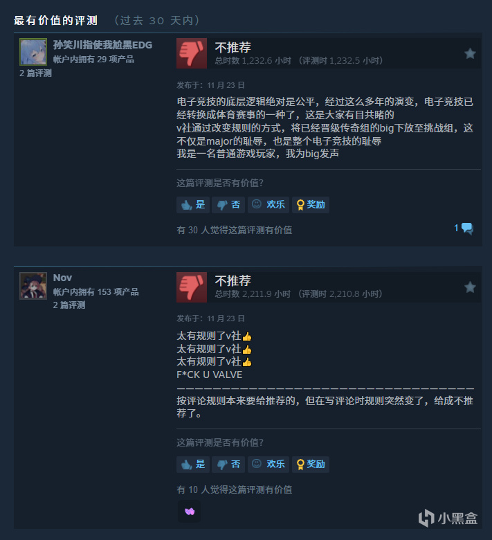 而另外一點則是最近V社突然修改比賽規則的事件,許多玩家通過差評來表達不滿