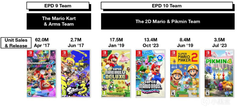 九組主要是負責馬里奧賽車系列,並參與了 《Arms》 等其他遊戲的創作;十組主要是負責1D和2D馬里奧系列,開發了《馬造》、《皮克敏》系列等等。