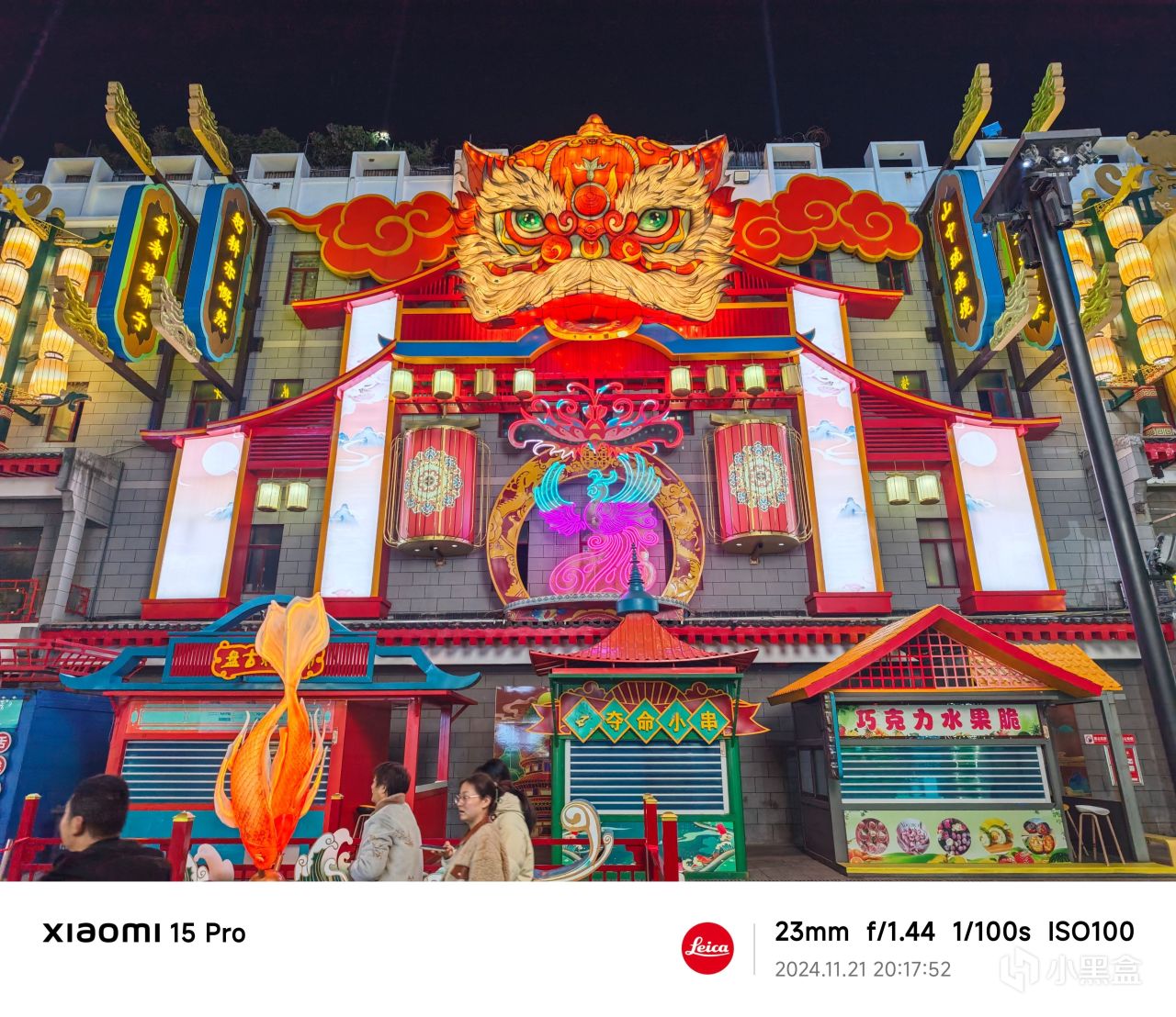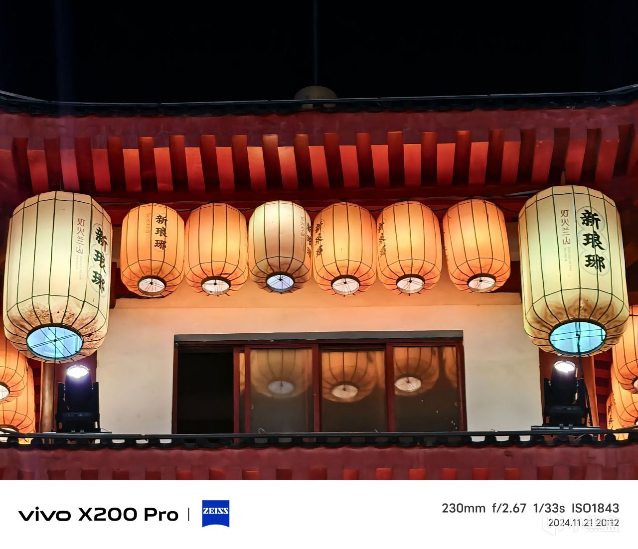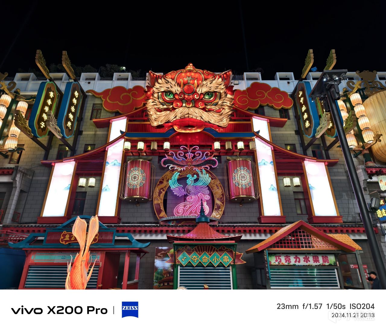 小米15 Pro的面對這種複雜的場景,有點失控了。兩側牌匾的字體明顯發虛,光源發散。同時,整體亮度過高,遠沒有X200 Pro那樣的質感。