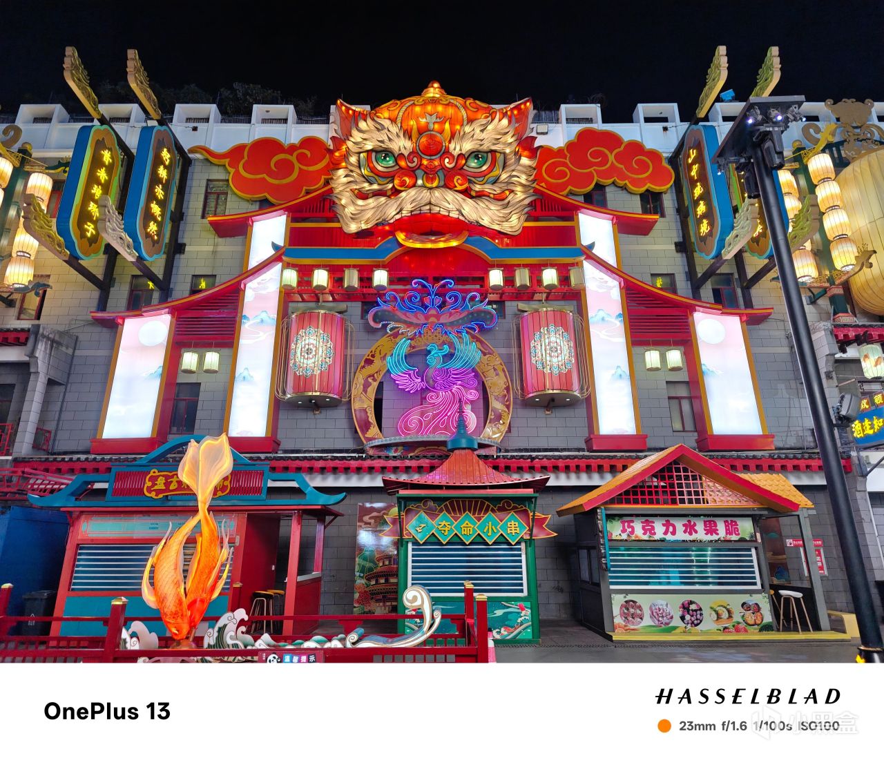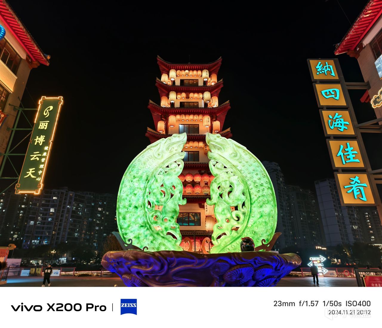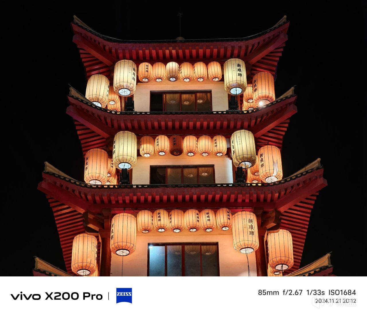 小米15 Pro的面對這種複雜的場景,有點失控了。兩側牌匾的字體明顯發虛,光源發散。同時,整體亮度過高,遠沒有X200 Pro那樣的質感。
