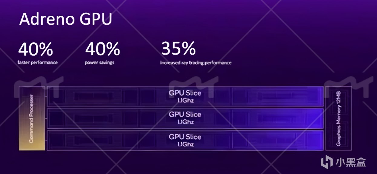 這次高通對GPU採用了全新的切片設計,分爲三組,頻率達都高達1.1GHz,接受指令處理器的統一調度。光線追蹤的性能提升可達35%。