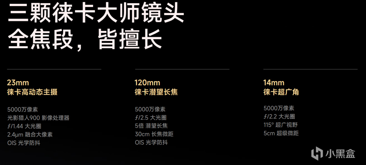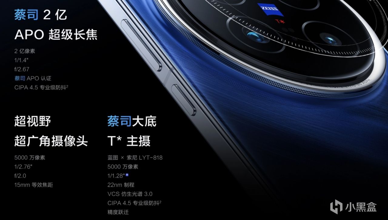 主攝,LYT818,索尼1/1.28英寸傳感器,長焦三星HP9,1/1.4英寸傳感器,3.7倍光學變焦,蔡司APO超級長焦,支持長焦微距,超廣角三星JN1,1/2.76英寸傳感器。