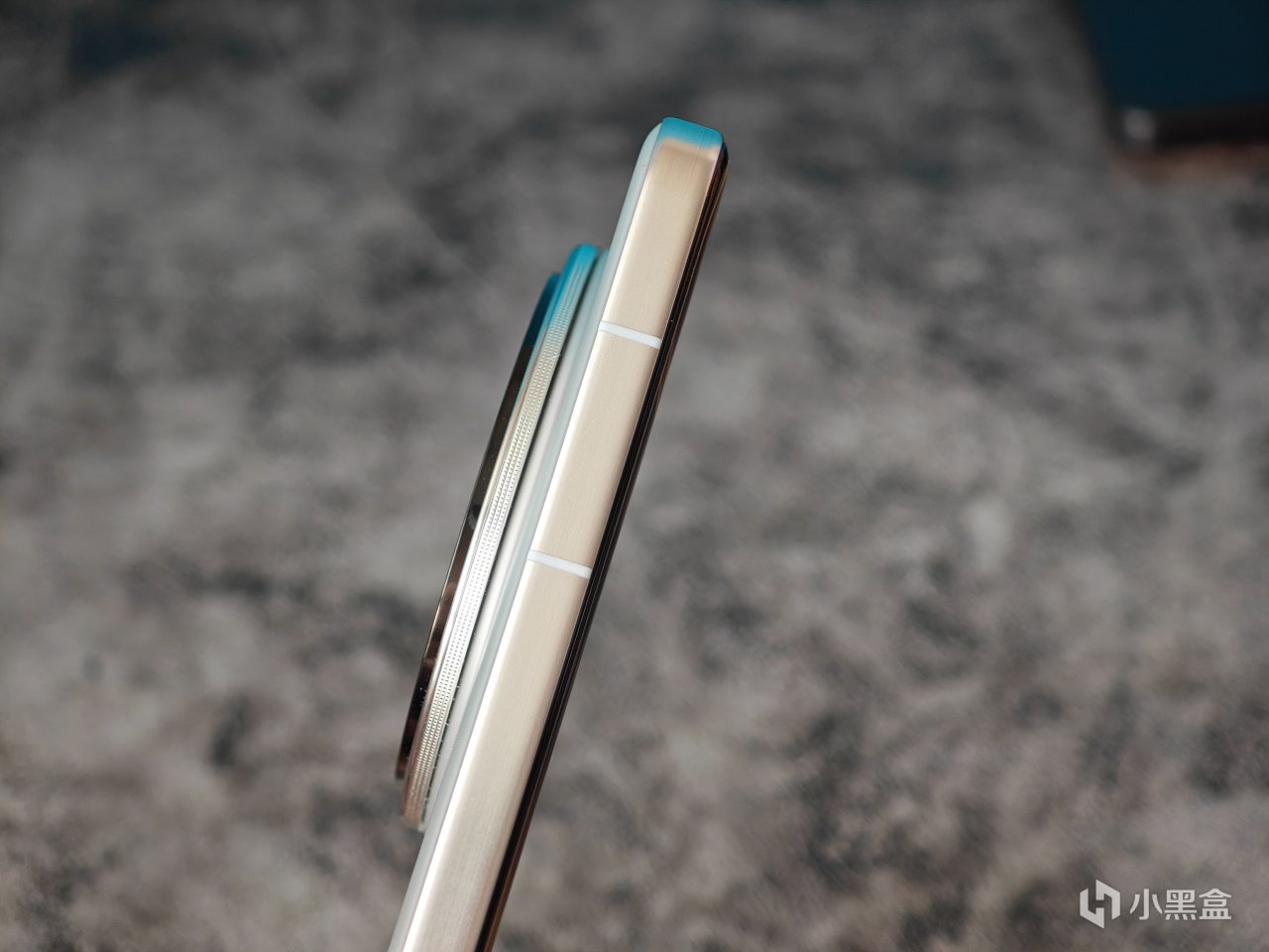 中框改爲直邊造型,鈦色的中框做了點拉絲的處理。