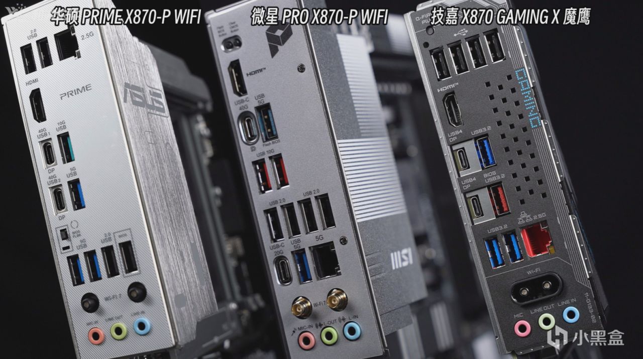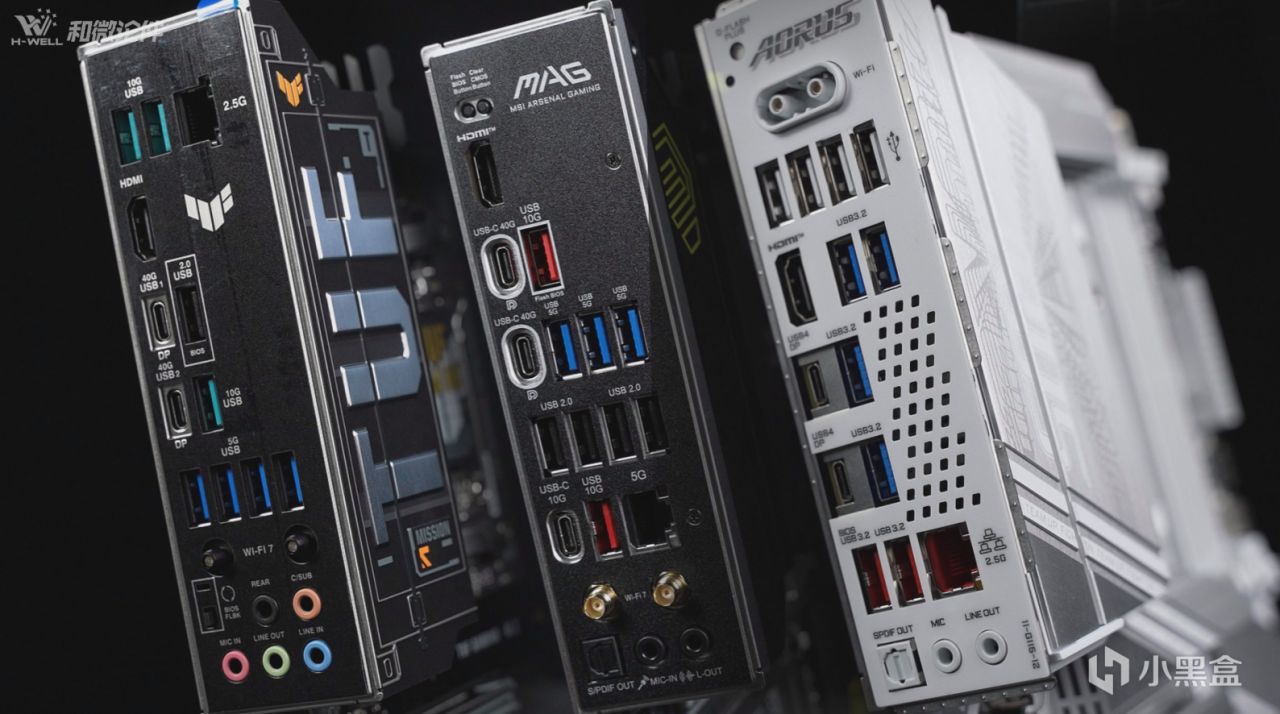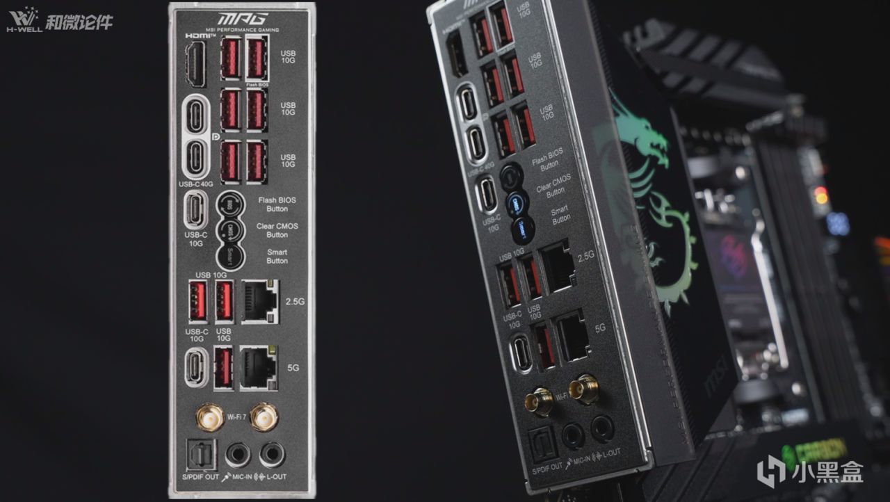 我们再来看一看背后I/O接口的部分,这三张主板是都配备了40Gbps的USB 4接口,华硕与技嘉给到了2个,微星则是1个40Gbps,1个20Gbps。