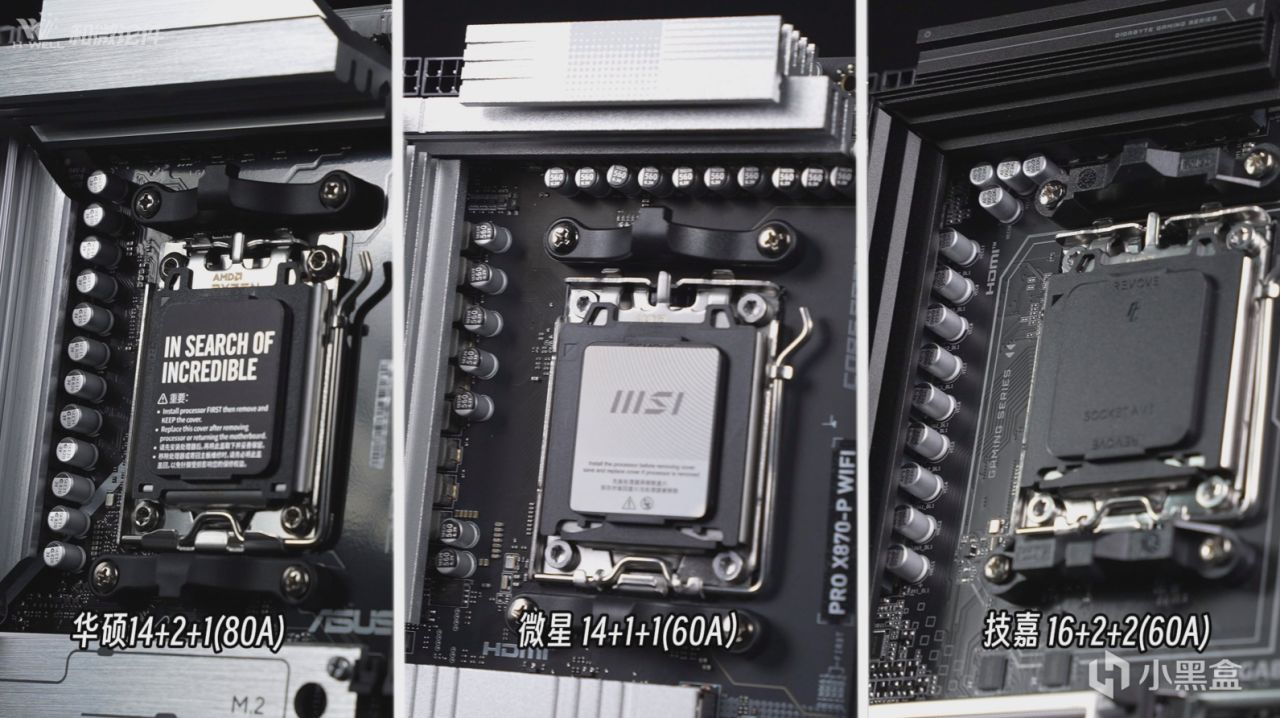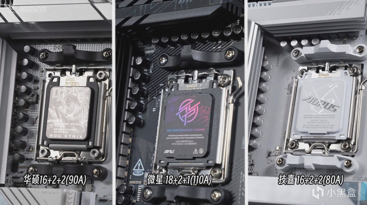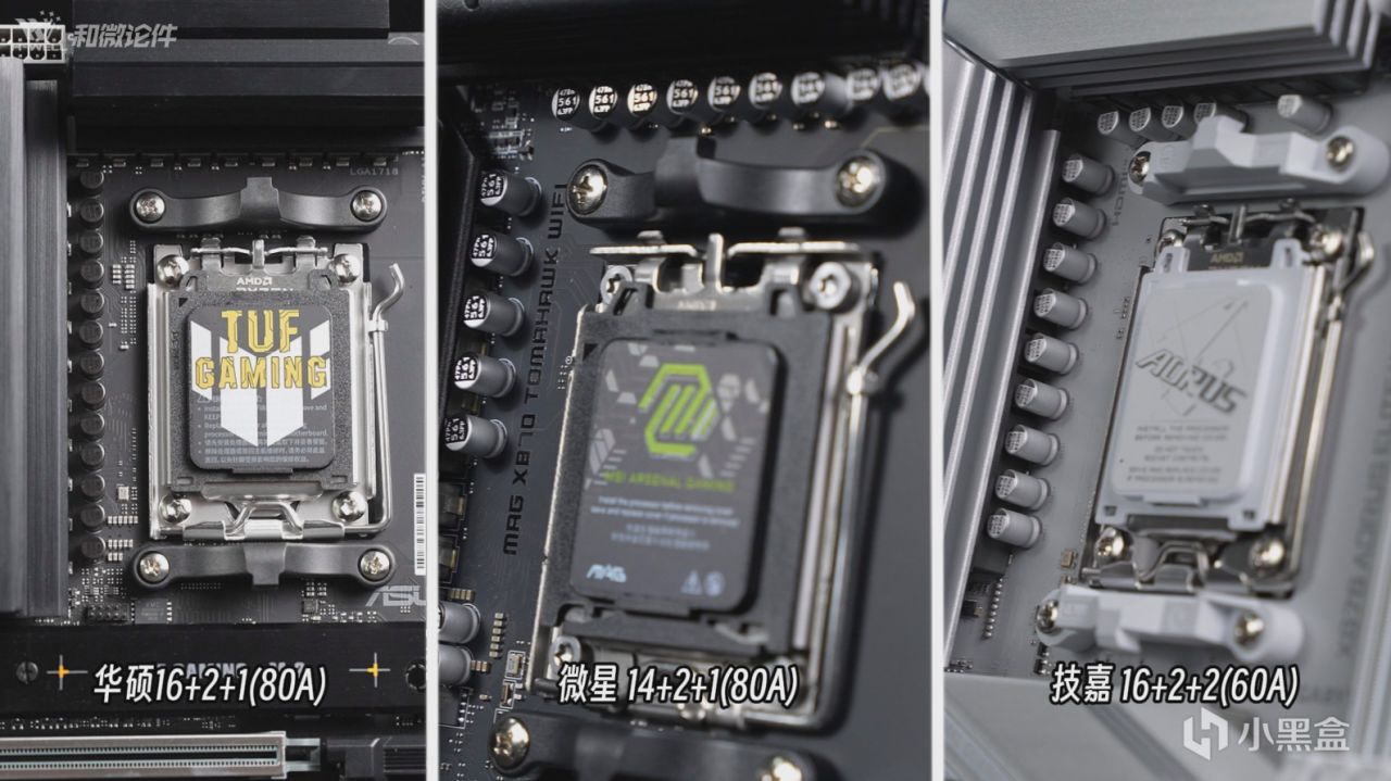 CPU的供电接口方面,这三张主板都使用了双8pin 的供电,技嘉的X870冰雕在散热马甲里给了一根8mm的热管,而华硕和微星没有,这3张主板的CPU供电大家可以直接看图。