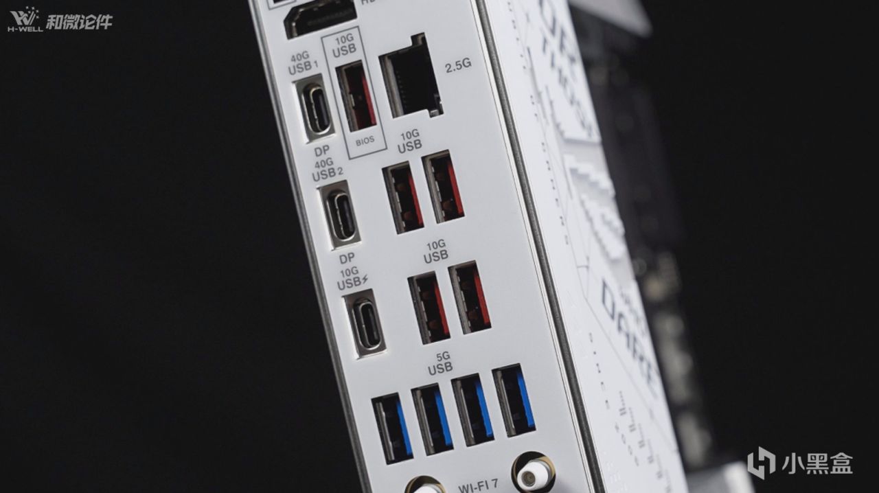 在背后的I/O面板上,微星的X870 CARBON暗黑还是非常够意思的,除了2个40GBPS的C口以外,一共给到了9A+2C共11个10GBPS的接口,对于有生产力的小伙伴来说,这个接口数量是非常丰富了。