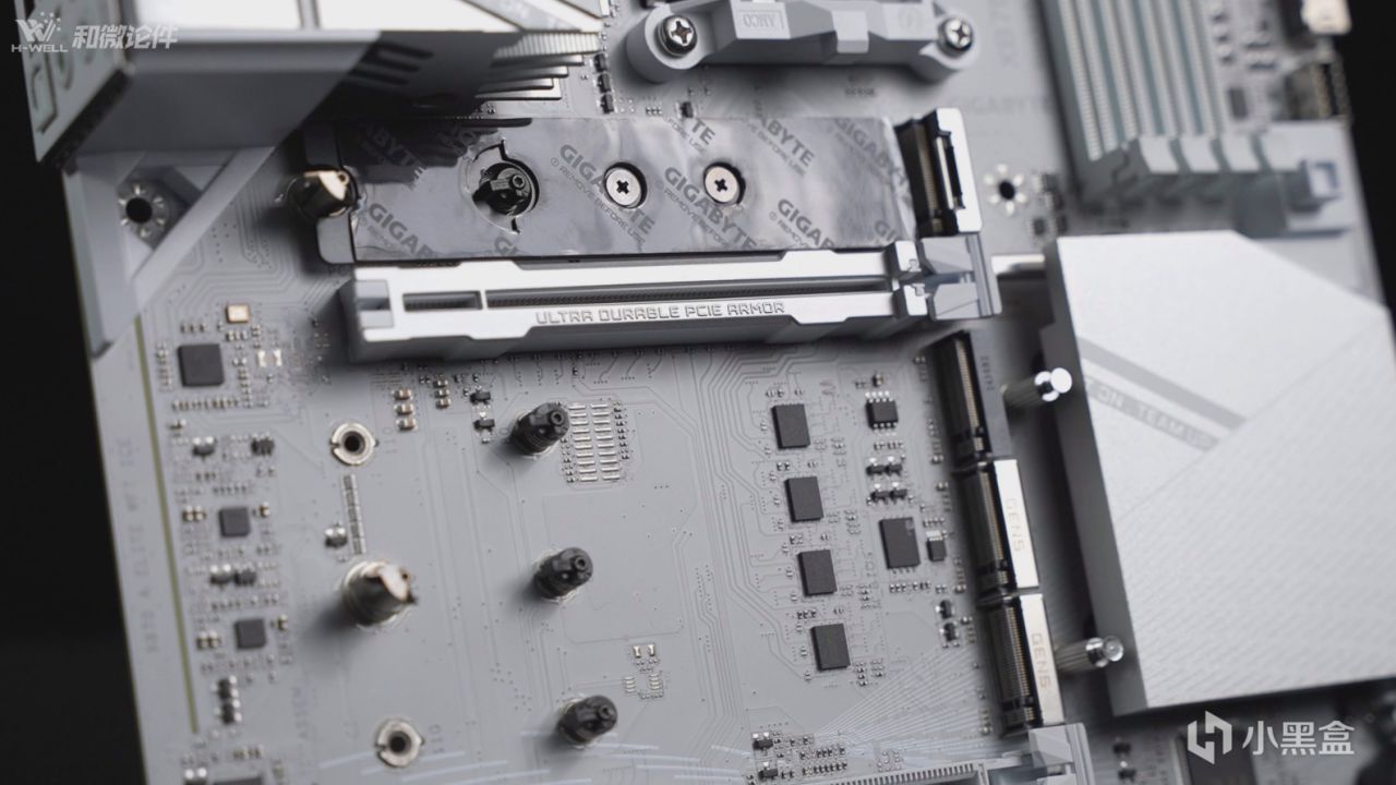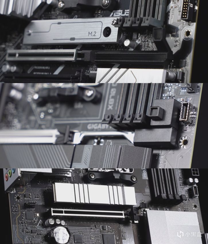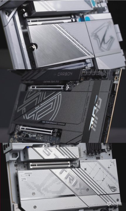 这一次3张主板的每个硬盘位都覆盖了散热装甲,微星和技嘉都支持快拆,而ROG-A只有1个5.0x4的硬盘位支持快拆。