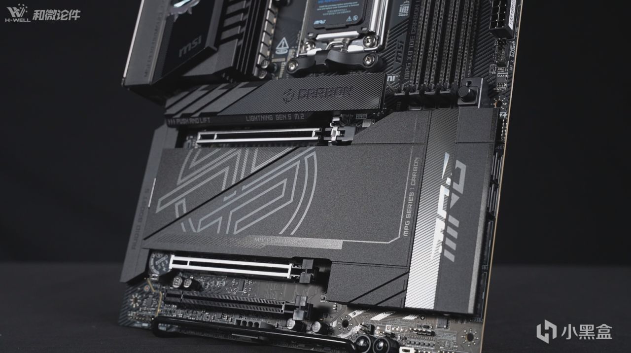微星的X870E CARBON 暗黑这张主板你在海鲜市场是可以找到2900多元的价格,除了显卡插槽外,微星是给到了一条5.0x4和一条4.0x4的PCIe扩展槽。因为第二条M.2与5.0x16的显卡插槽和第二条PCIe插槽是直连CPU的,如果接入固态硬盘,显卡则会运行在PCIe5.0x8,不过好在固态插满对于另外两条PCIe插槽不会有影响。