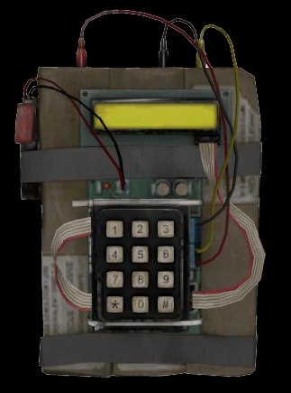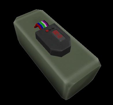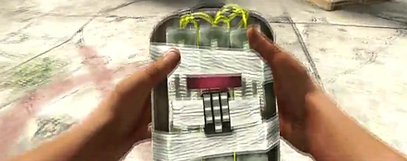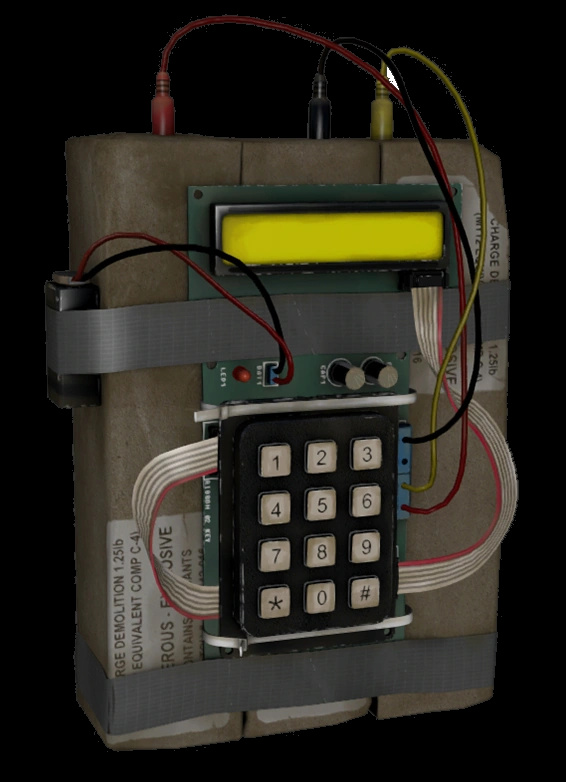 炸弹的外观为一个灰绿色的长方形,正面有着按钮,旁边则是几块电路板,然后有几根线连接着炸弹本体