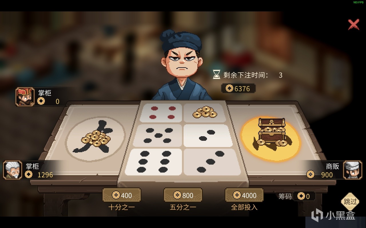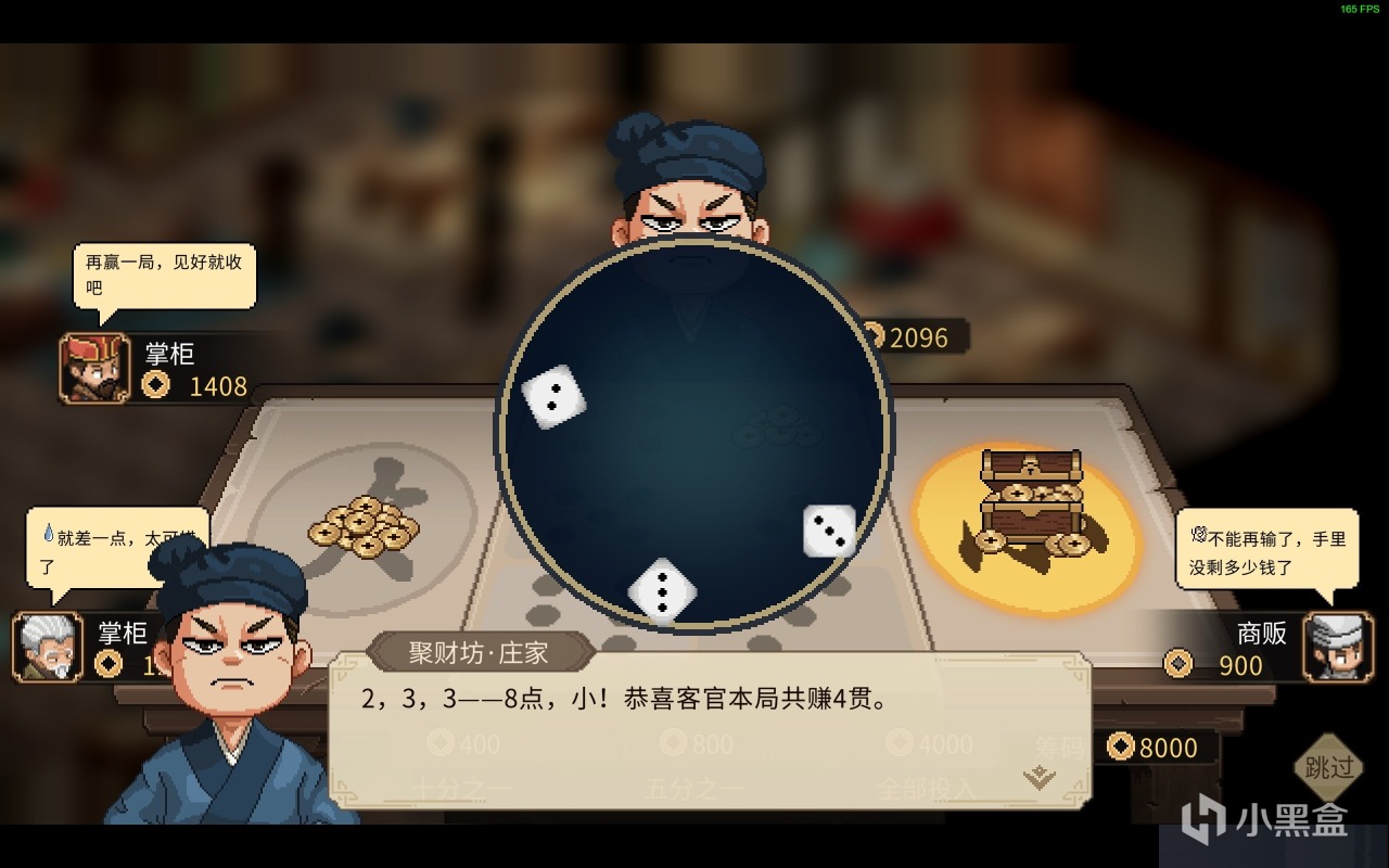 既然是城里了,那必不可少的地方就是赌场了,这同样是我家财百贯的一个起始地!进入赌场玩的就是心跳,玩的就是搜哈!带上1000文的保底之后就是赌大赌小和赌点数的时候了。想要更加刺激就全部搜哈大或小!