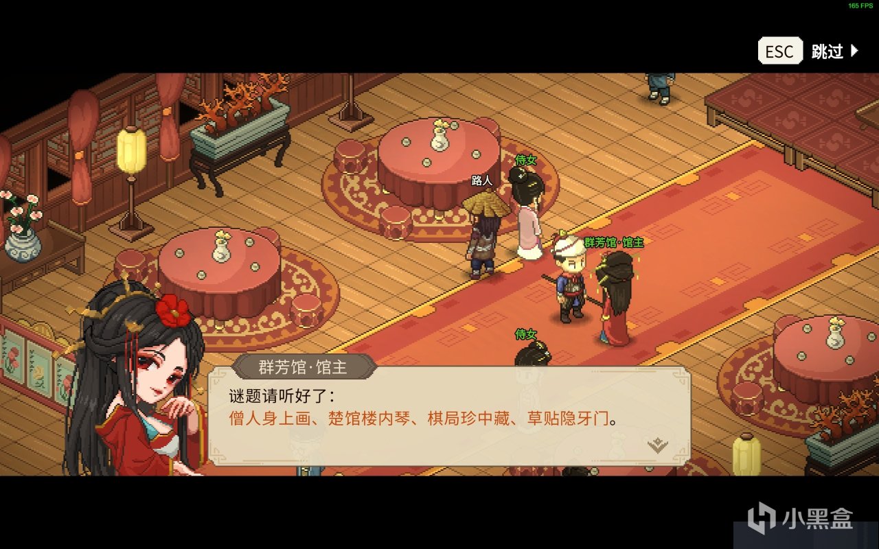 再往城里走走,“红香绿玉深庭长日静,两两出婵娟”原来是来到了才子佳人吟诗歌唱的地方了,咳咳,当然作为一个正经人来说咱指数单纯想去看看是不是如传闻之中一样花魁会放出迷题让大家解答,才不是为了看小姐姐。当然如我所料,果然花魁托老鸨放出了一个谜底让玩家们去寻味。