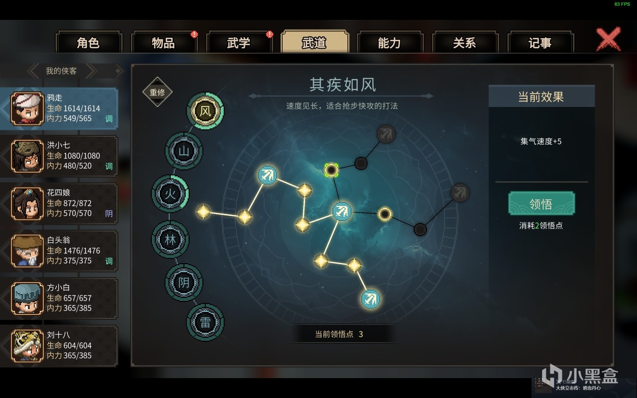 当然在武侠之中肯定也不止内外武功之分,还有着像什么任督二脉啊之类的奇经八脉,在游戏之中则是分成了风火林雷等几个不同的分支,然后利用我们所获得的经验点根据脉象去点出所想要的加成节点,目前咱也不知道能不能点完,数量上来说那是相当的多啊!