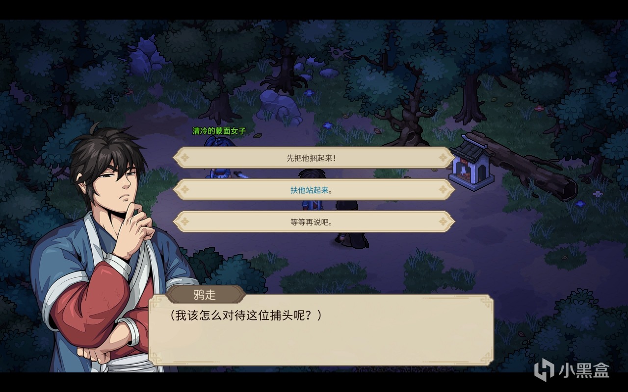 而从这里开始,游戏之中最重要的一个核心理念就出现了,那就是玩家们本身的选择高于一切,一切的起因和结果都将会是玩家们自身的选择而出发。玩家们很巧合的在树上睡觉,两个高手又很巧合的在树下打架并且两败俱伤动弹不得让玩家们捡尸,而捆绑燕子窝的人还是神捕门的人都是在与玩家们自身的一念之间!(你的选择将会影响在江湖中其他人对你的态度)