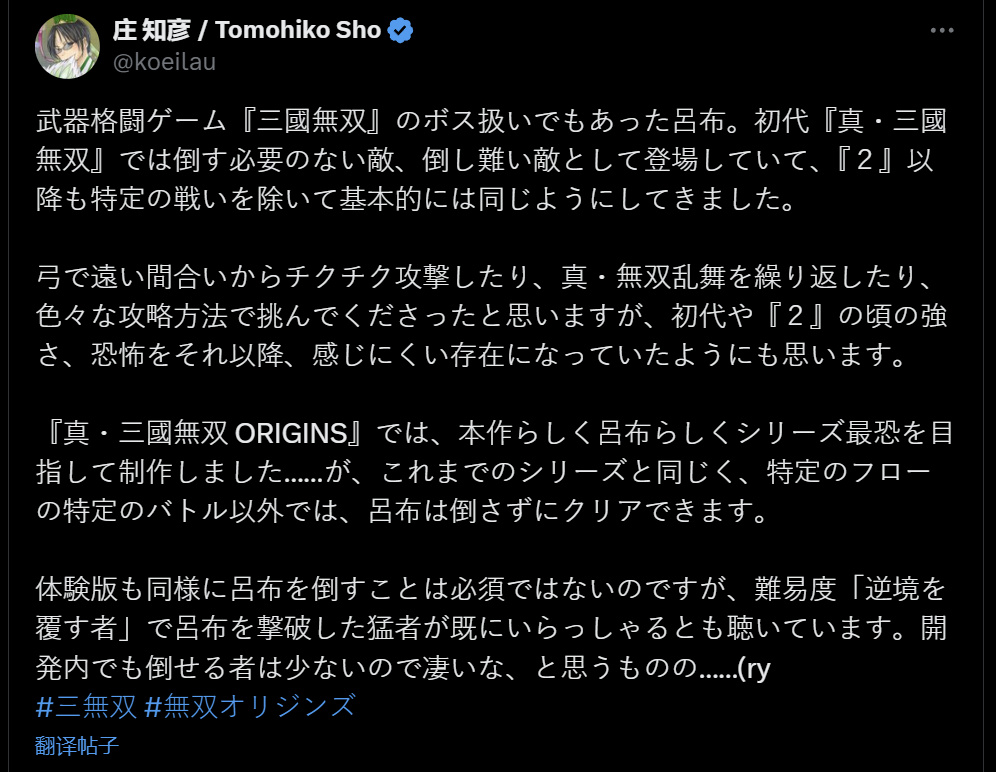 該作的製作人莊知彥近日在推特上發文盛讚那些擊敗呂布的猛士,並表示“即使是我們開發團隊裏也沒幾個人能做到”。