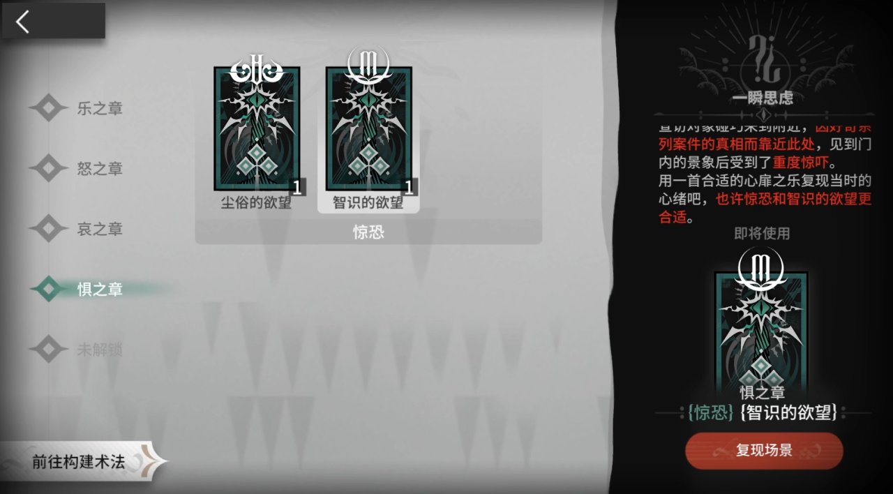 進入開始查訪,然後一直點跳過到要選擇心情,根據提示或者選錯3次,例行的任意3個同顏色+塵俗,權柄,智識合成,密令的今天的是驚恐3綠+智識。悔恨2綠1藍+塵俗。未來的是煩惱 1橙1紅1綠+塵俗,緊張 2橙1綠+智識。畏縮 1紅2綠+智識。悲憤 1紅2藍+智識。