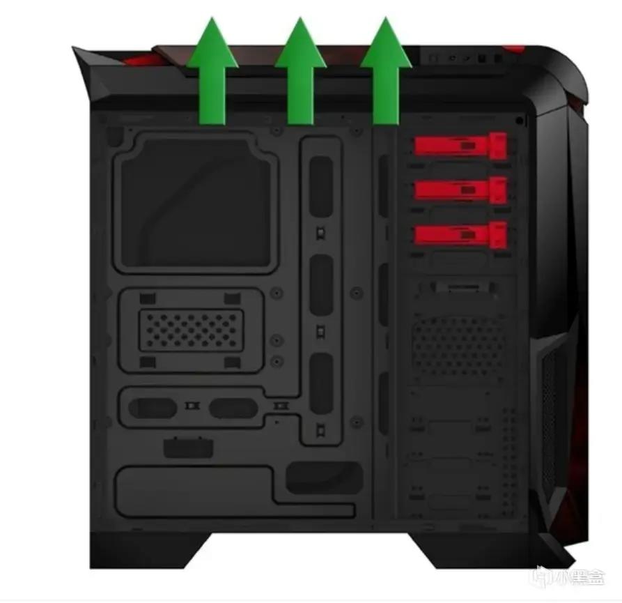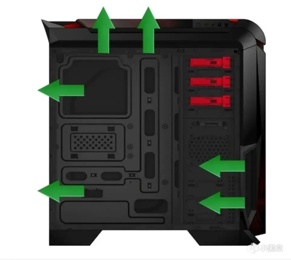 設計理念:冷風從機箱底部抽進,利用了熱空氣上升的原理,避免顯卡阻擋熱空氣上升,一般配有防塵設計,機箱頂部開有散熱窗。