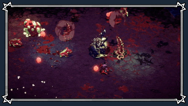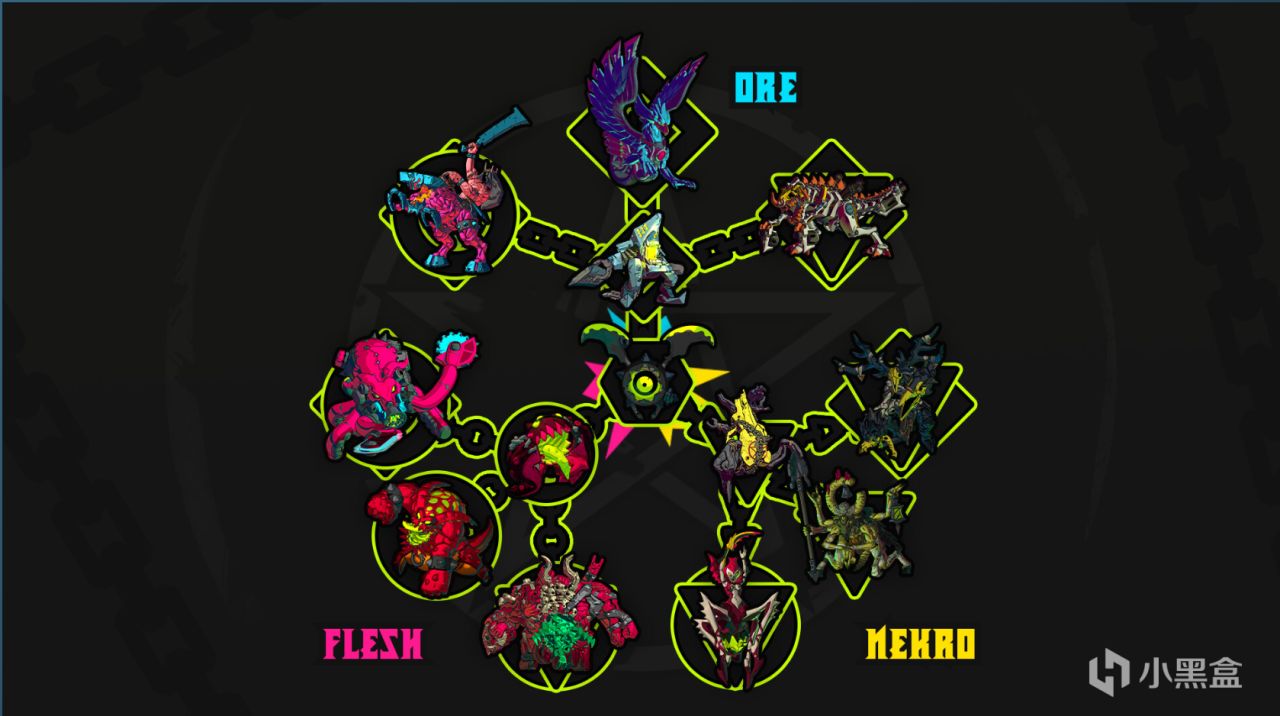 其實雖然說是類哈迪斯遊戲,但其實遊戲玩起來的感覺完全不同。遊戲的美術更是與哈迪斯的風格大相徑庭,本作風格十分獨特,主角並不是傳統的勇者之類的角色,反而是一個吞噬血肉的怪物,進化後的形態頗有些戰錘怪物的神態,有的肚子上長個血盆巨口,有的觸鬚上長出個電鋸,還有的手上有兩個鏈錘,每一個都是身懷絕技。操控着這些怪物吞噬一個個血肉居然讓我產生了莫名的爽感。