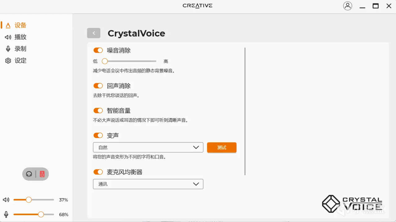 ▼在語音通訊方面,Sound Blaster G8 也配備了Crystal Voice技術,這是創新科技標榜的核心音頻技術。它具備雙向降噪功能,能夠智能地消除背景噪音和干擾性的回聲,減少外部噪聲對人聲清晰度的影響。當然,摳腳大漢喜歡的變聲功能自然也沒有缺失,祈禱自己別遇到吧。