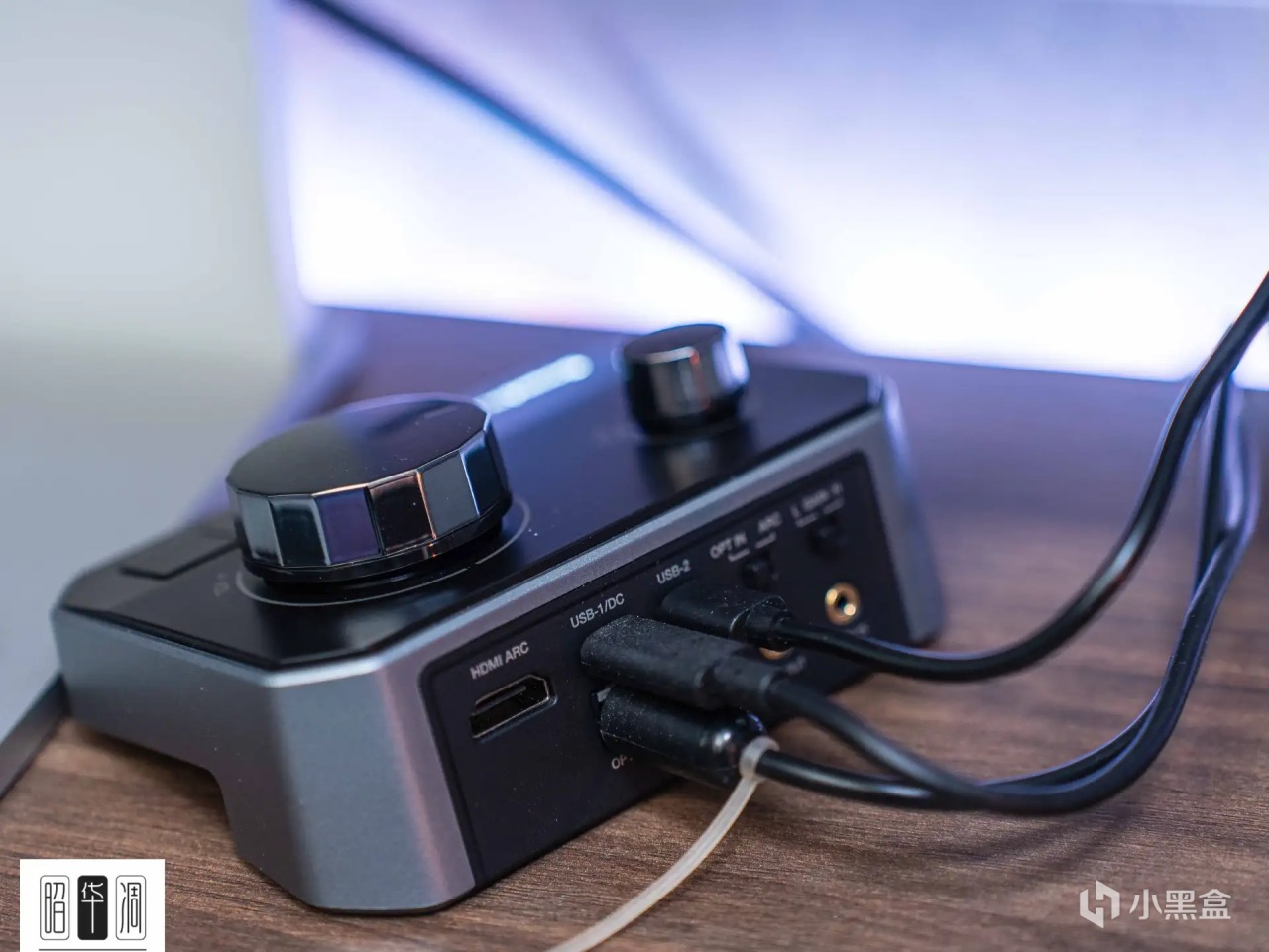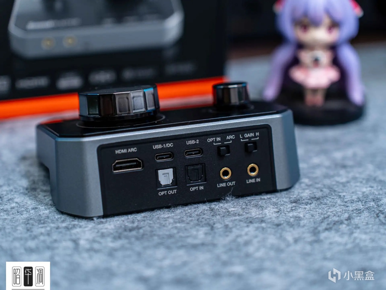 ▼創新 Sound Blaster G8 尺寸雖小,輸入端的配置還是比較豐富的。從左至右分別是 HDMI(ARC)端口、USB1 端口 / AC 電源、USB2 端口、光纖輸入 / HDMI 切換端口、耳機增益切換開關、光纖輸出 / 輸入端口、以及 3.5mm 線性輸出 / 輸入端口。