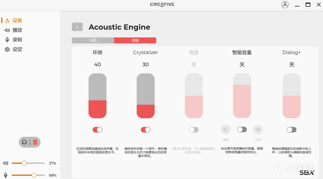 ▼Sound Blaster Acoustic Engine 是創新的一套完全可以自定義的音頻處理技術,適合玩家根據自己的需求進行精細調節,具體調節可以參考我之前的建議。