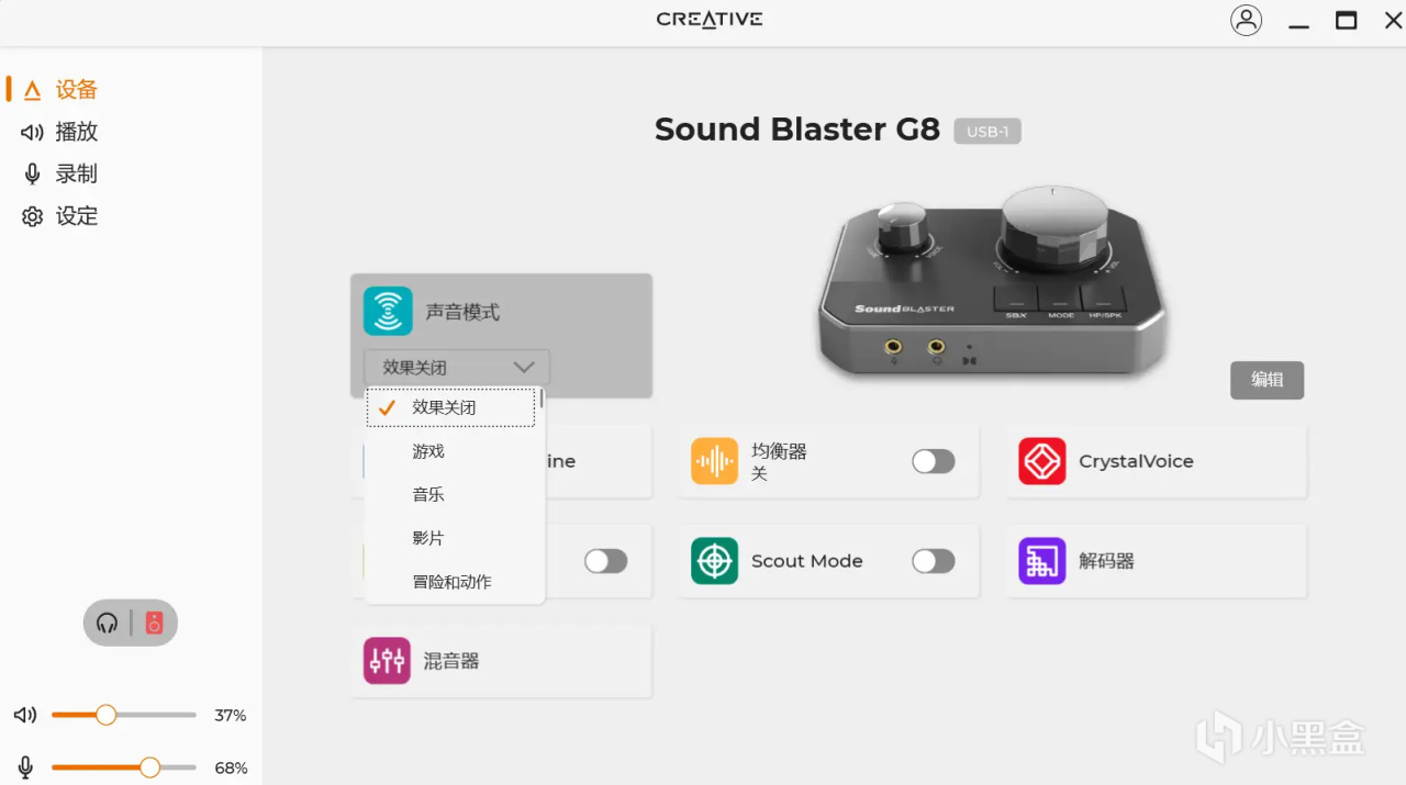 ▼通過Creative App,用戶可以輕鬆地在直接播放與渲染音效兩種模式之間切換,以滿足不同的聽覺需求。在直接播放模式下,Sound Blaster G8 能夠忠實地再現音頻源的原始音質,適合那些追求高保真音質的音樂愛好者。而在渲染音效模式下,它通過增加環境音效和虛擬環繞聲效果,爲用戶提供更加沉浸式的聽覺體驗