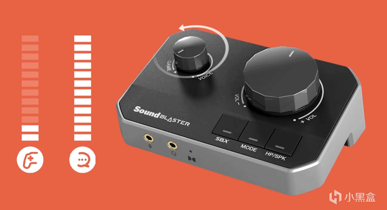 ▼控制按鈕集中於設備頂部,方便操控。大小旋鈕分別爲調整音量增益和 GAMEVOICE MIX (平衡遊戲音樂與語音音量),三個按鍵分別對應 SBX 模式、直接播放、耳機 / 音箱切換。