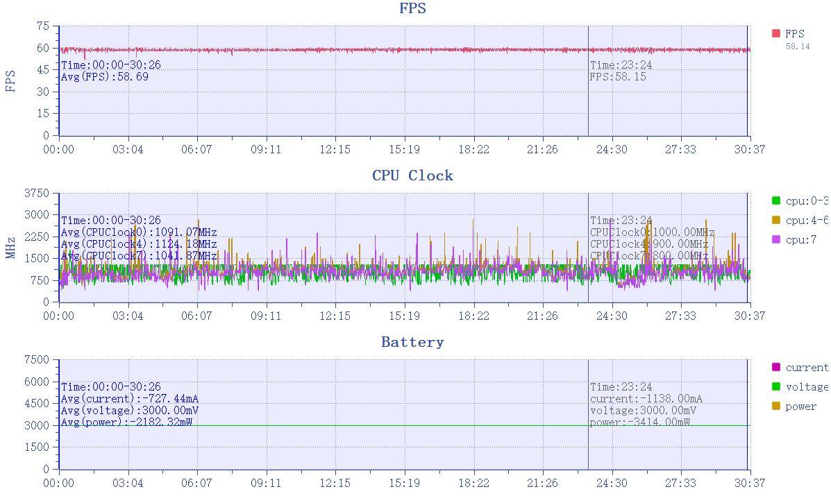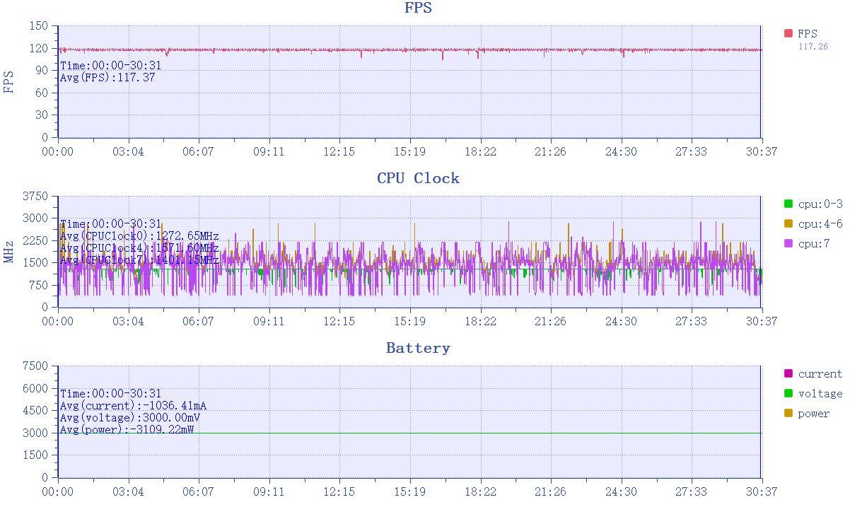 手机开启电竞模式后,游玩半小时120帧最高画质《王者荣耀》,画面的平均帧率为117.37 FPS,部分团战时,画面帧数偶尔降至110 FPS,但是人眼并未察觉到画面卡顿。