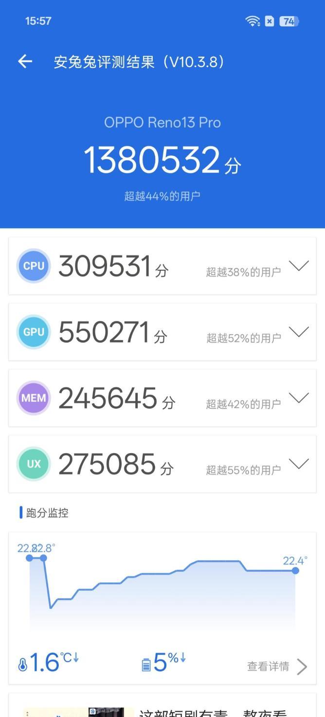 在安兔兔综合性能跑分测试中,Reno13 Pro最终成绩为1380532分。
