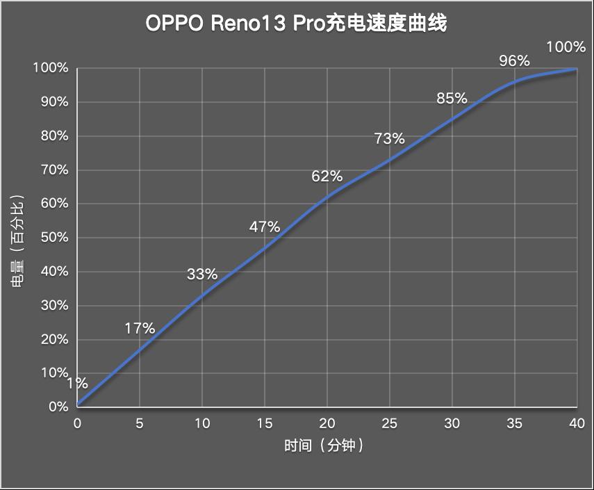 Reno13 Pro放电至1%后,为其进行充电,5分钟充电17%;10分钟充电33%;15分钟充电47%;20分钟充电62%;25分钟充电73%;30分钟充电85%;35分钟充电96%,40分钟充至满电。