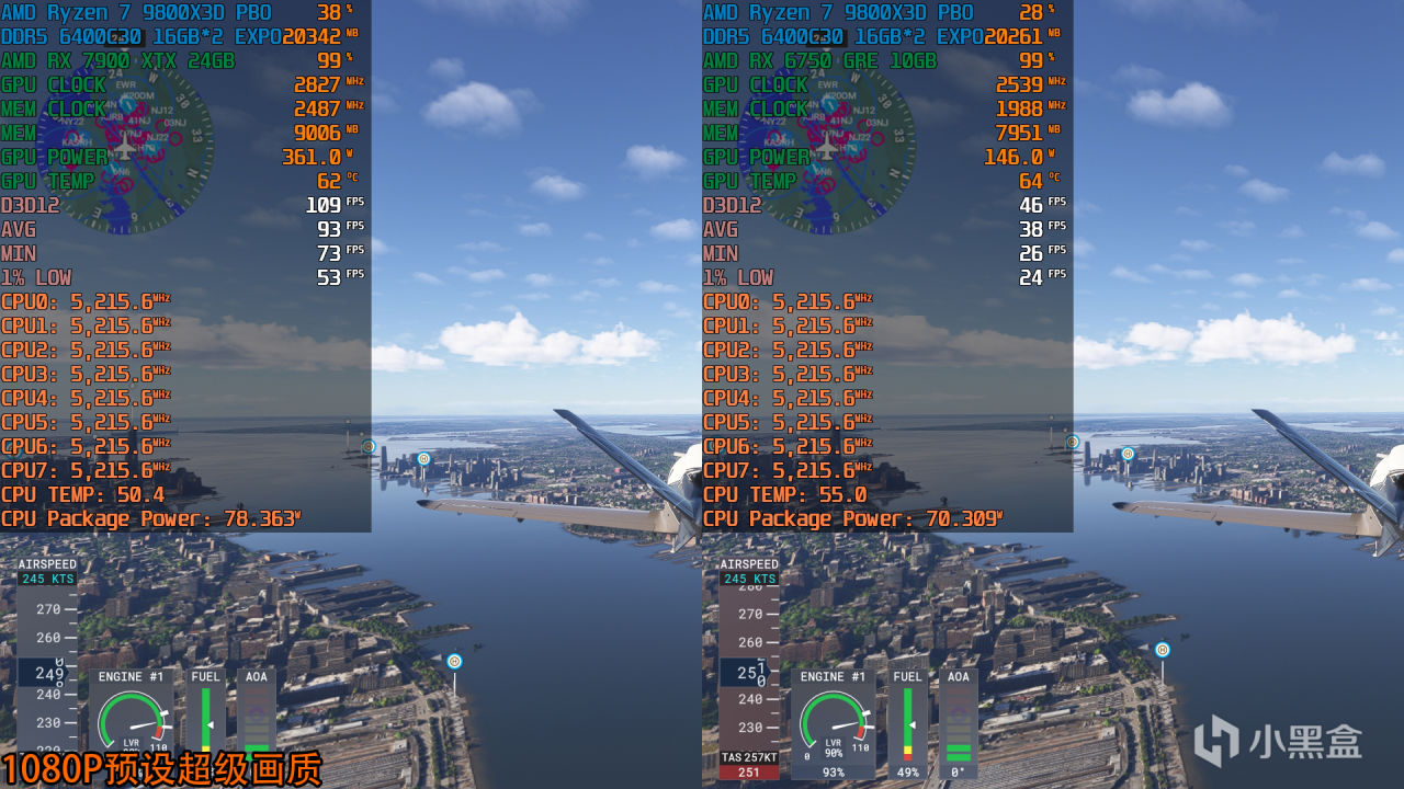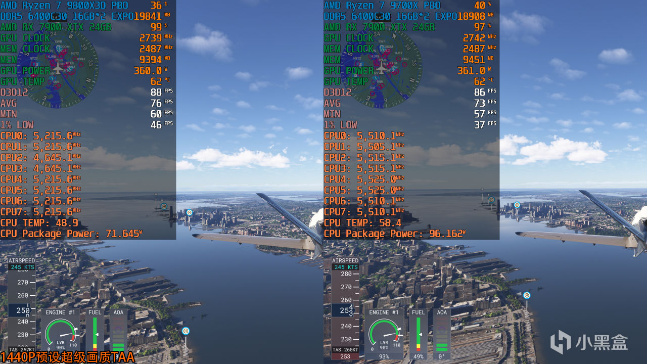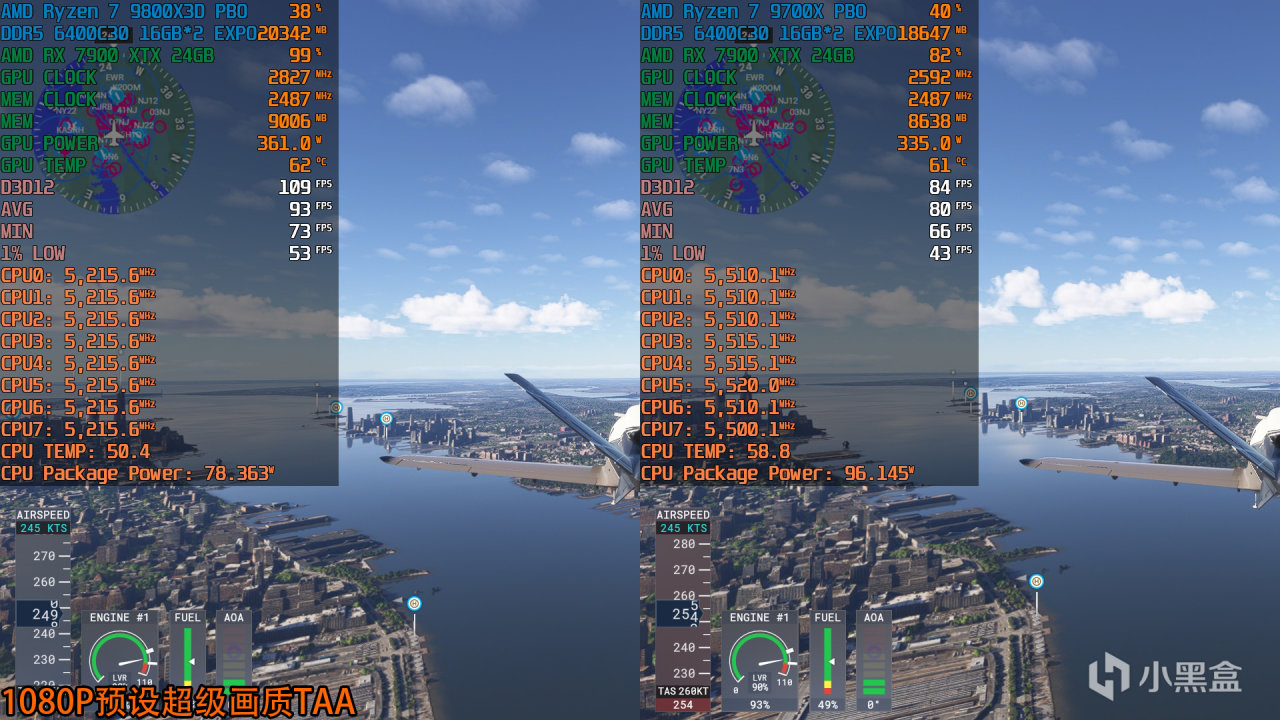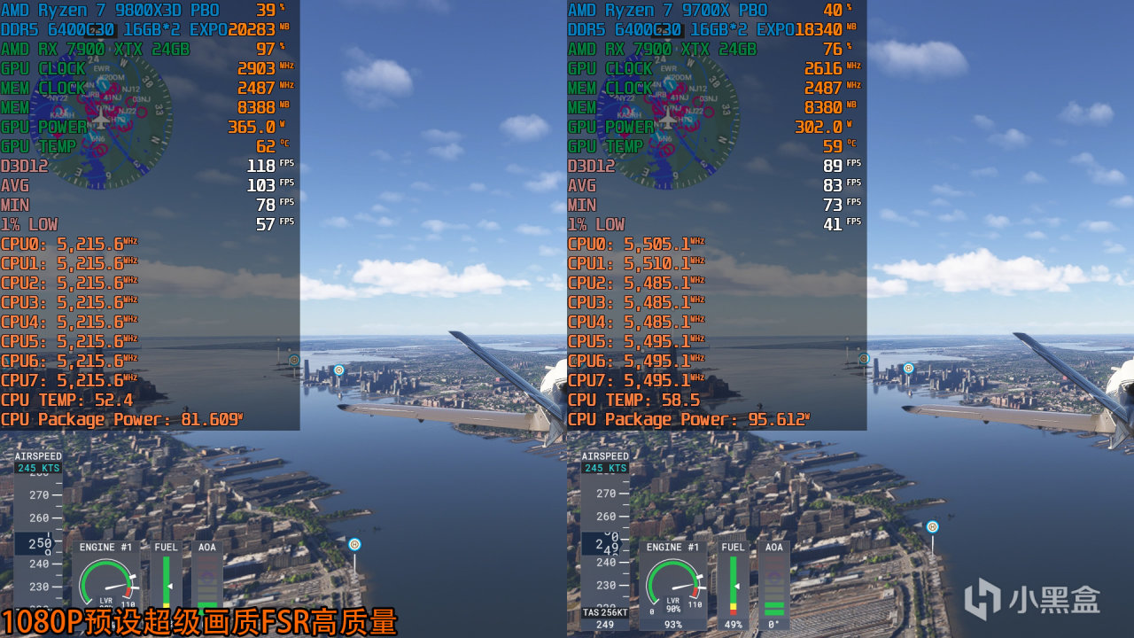从9800X3D和9700X在1080P测试结果来看,纽约这个场景显然也会看重CPU性能,个人猜测是城市内的交通数据更为影响CPU,而拥有更大缓存的9800X3D就正中它的优势,包括开启FSR后也能进一步发挥整体性能,平均帧和1% LOW帧相较9700X都有明显提升,也让GPU占用率趋近100%。